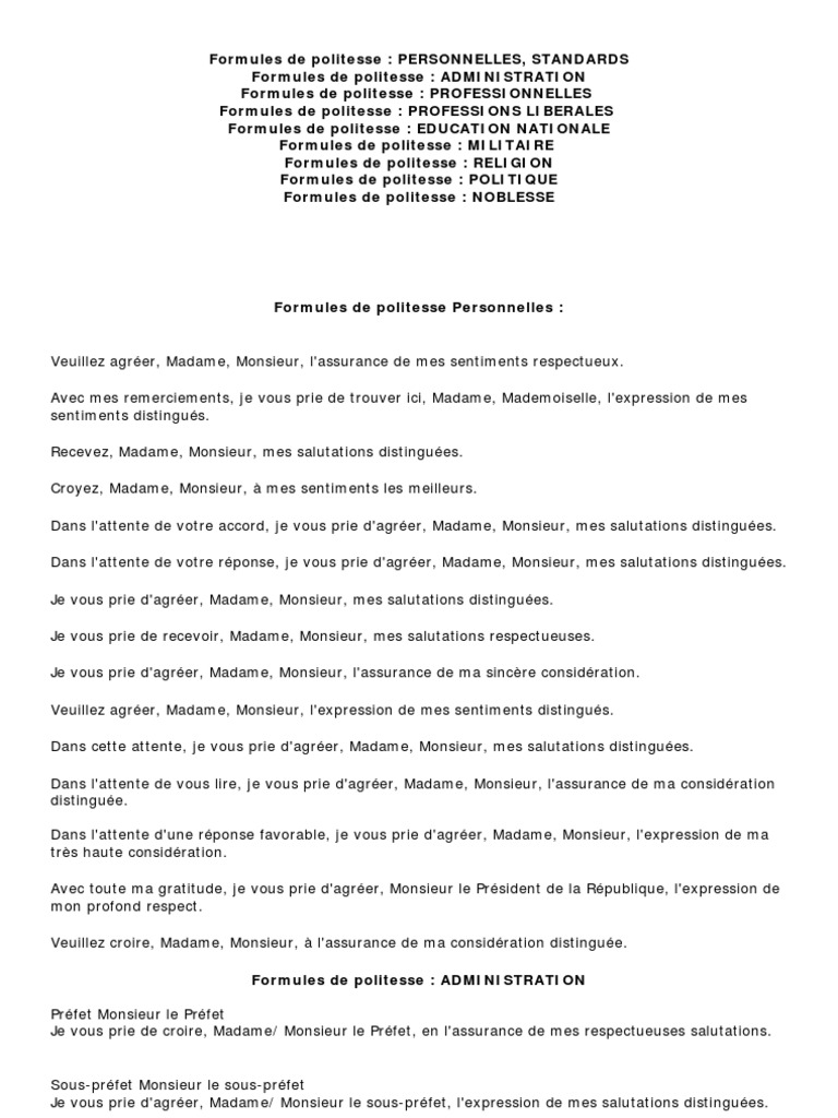 Académicien ancien ministre ou secrétaire détat ministre plénipotentiaire premier président de la cour dappel avocat général conseiller détat à la cour de. LES FORMULES DE POLITESSE Un courrier administratif ou commercial se termine traditionnellement par une formule de politesse. Formule de politesse classe Formules de politesse ADMINISTRATION - ABC-Lettres par lOb.