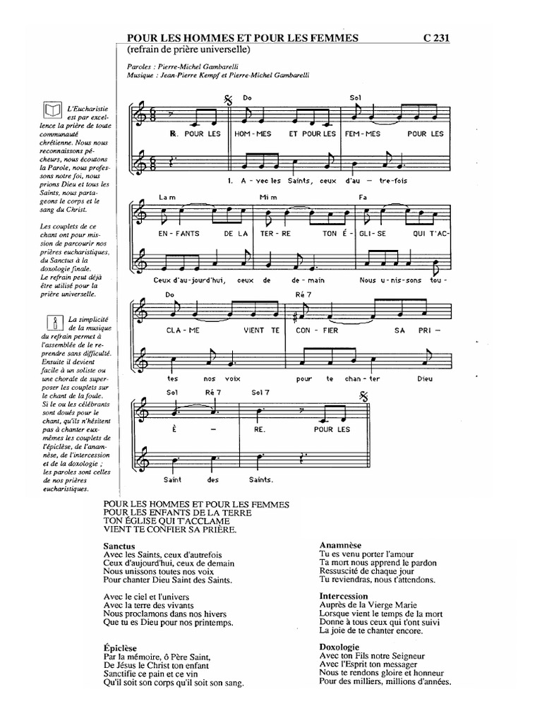 Avec le ciel et lunivers Avec la terre des vivants Nus proclamons dans nos hivers Que tu es Dieu pour nos printemps. Pour les hommes et pour les femmes Prière universelle Pour les hom mes et pour les fem mes pour les en fants de la ter re ton E DO SOL LAm MIm 8 6 gli se qui tac cla me vient te con fier sa pri è re. Les professeurs des petites classes et les professeurs des écoles de musique recherchent plus traditionnellement des partitions de chansons pour enfants ou des comptines les professeurs de collège ont besoin dune grande variété de documents certains encore.